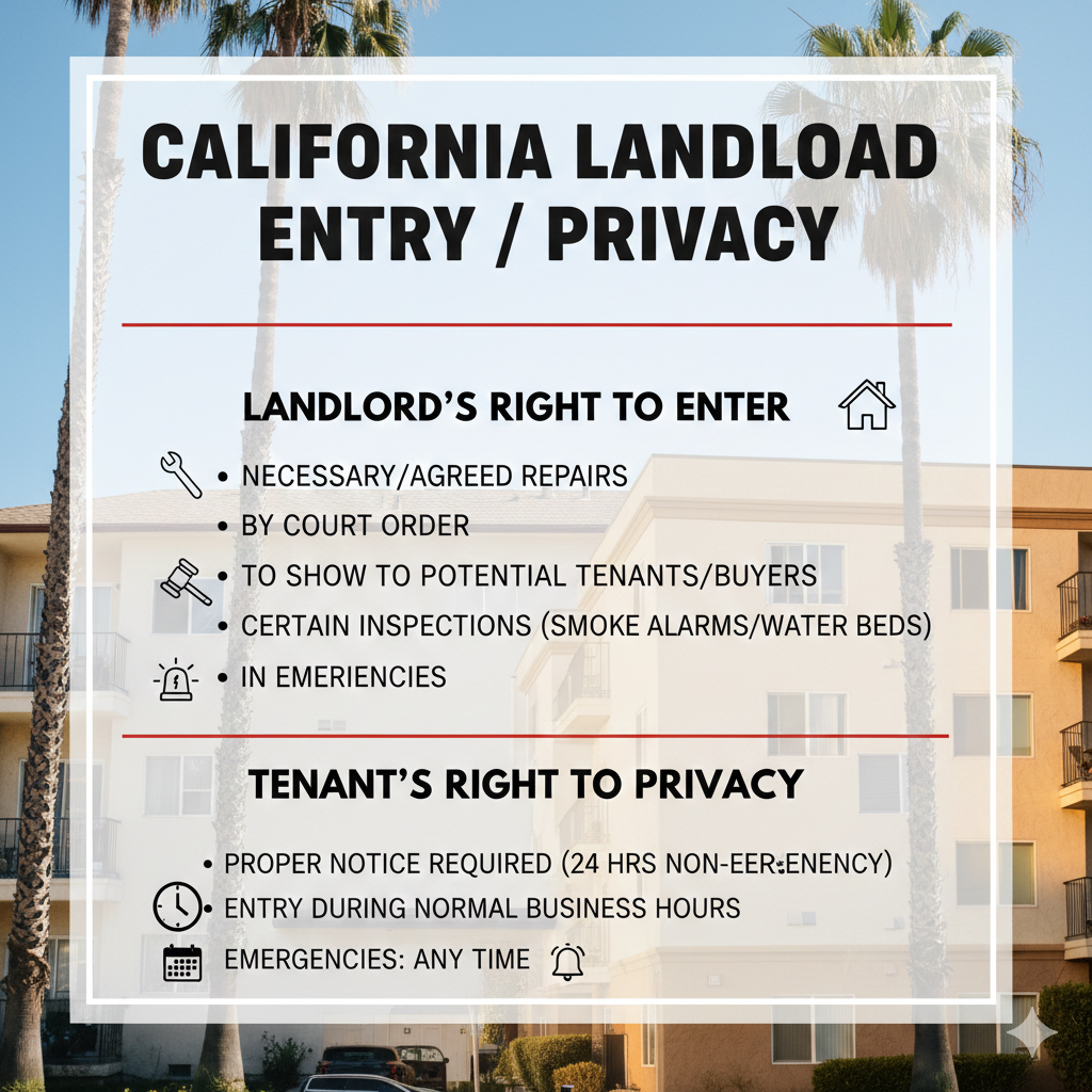 Landlords are only allowed to enter a tenant’s unit for certain reasons and with proper notice. A landlord is allowed to enter the rental to make necessary or agreed repairs, by court order, to show to potential tenants or buyers, for certain inspections (like water beds and smoke alarms, but not general inspections), or in the event of an emergency. Emergencies can happen at all hours, but non-emergencies require adequate notice (usually at least 24 hours) and entry during normal business hours.