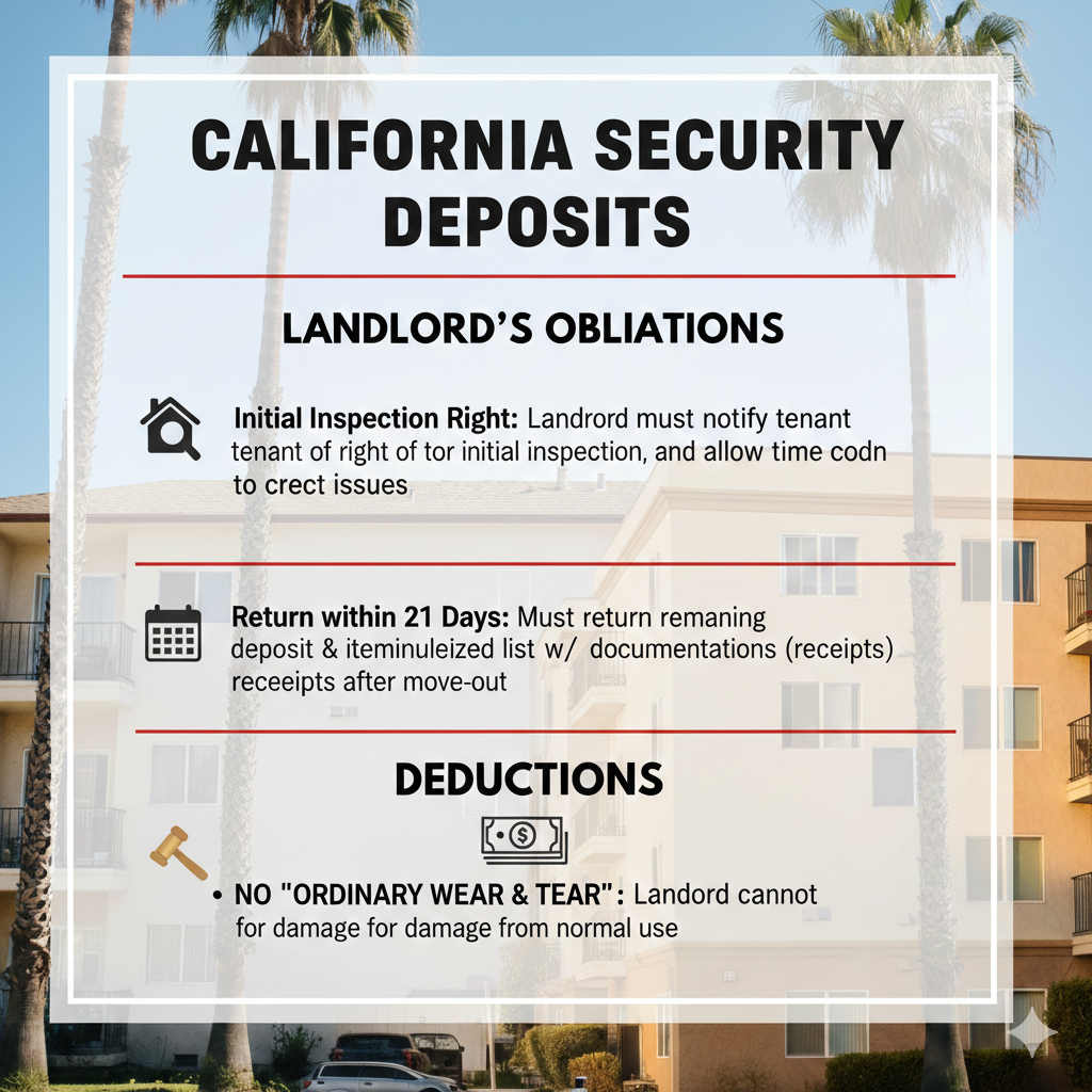 A landlord is required to notify a tenant of the tenants right to request an initial inspection. The landlord must give the tenant time to correct issues identified in the initial inspection. Within 21-days after the tenant moves out, a landlord must return the remaining portion of the security deposit and provide an itemized list of the deductions, with documentation (like receipts) of the work done. A landlord is not allowed to charge a tenant for repairing damage that is the result of ordinary wear and tear.